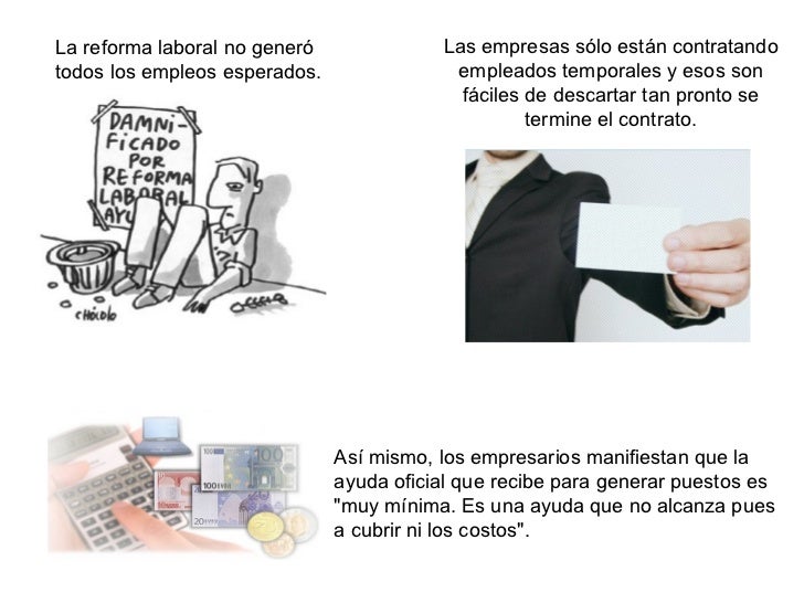 - 3. La reforma laboral no generó todos los empleos esperados. Las empresas sólo están contratando empleados temporales y esos son fáciles de descartar tan pronto se termine el contrato. Asà mismo, los empresarios manifiestan que la ayuda oficial que recibe para generar puestos es "muy mÃnima. Es una ayuda que no alcanza pues a cubrir ni los costos".