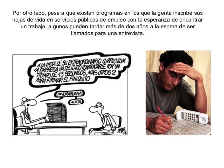 - 4. Por otro lado, pese a que existen programas en los que la gente inscribe sus hojas de vida en servicios públicos de empleo con la esperanza de encontrar un trabajo, algunos pueden tardar más de dos años a la espera de ser llamados para una entrevista.