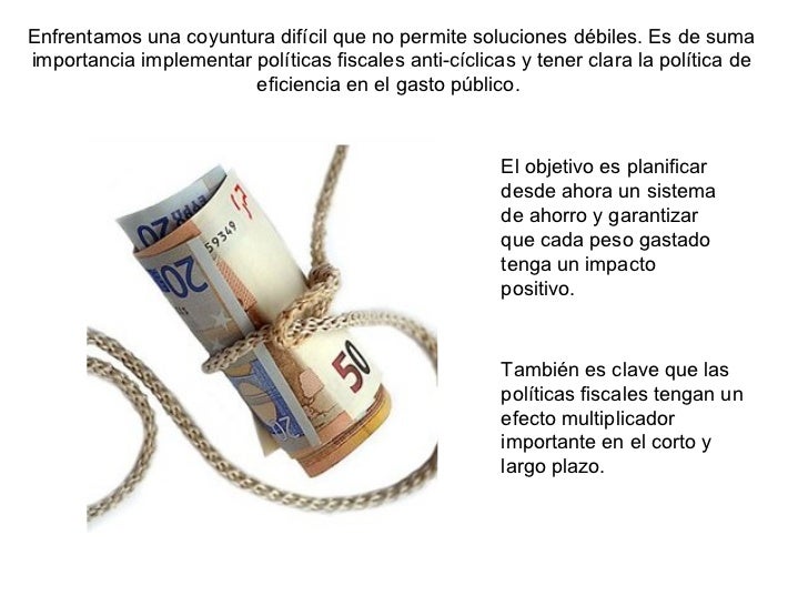 - 5. Enfrentamos una coyuntura difÃcil que no permite soluciones débiles. Es de suma importancia implementar polÃticas fiscales anti-cÃclicas y tener clara la polÃtica de eficiencia en el gasto público. El objetivo es planificar desde ahora un sistema de ahorro y garantizar que cada peso gastado tenga un impacto positivo. También es clave que las polÃticas fiscales tengan un efecto multiplicador importante en el corto y largo plazo