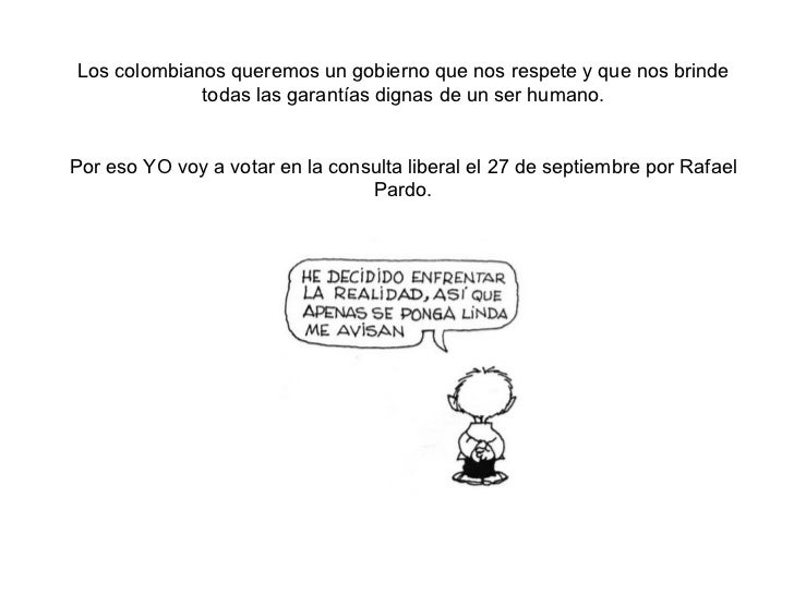 - 7. Los colombianos queremos un gobierno que nos respete y que nos brinde todas las garantÃas dignas de un ser humano. Por eso YO voy a votar en la consulta liberal el 27 de septiembre por Rafael Pardo.